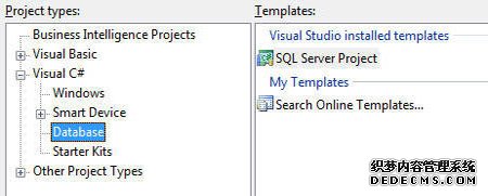 现在打开Visual Studio,并从文件菜单中选择“新建项目”。 在“新建项目”对话框中选择“Visual C#”下的“Database”。 然后选择“SQL Server项目”模板。