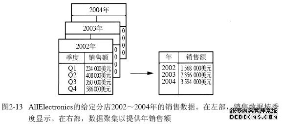 想像你已经为分析收集了数据。这些数据由AllElectronics 2002~2004年每季度的销售数据组成。然而,你感兴趣的是年销售每年的总和),而不是每季度的总和。可以对这种数据聚集,使得结果数据汇总每年的总销售,而不是每季度的总销售。该聚集如图2-13所示。结果数据集小得多,并不丢失分析任务所需的信息。