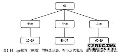 . 用于发现过程的背景知识:这种关于挖掘领域的知识对于指导知识发现过程和评估发现的模式是非常有用的。概念分层是背景知识的一种流行形式,它允许在多个抽象层挖掘数据。概念分层的一个例子是age属性或维)的概念分层,如图1-14所示。用户对数据中联系的信赖是另一种形式的背景知识。