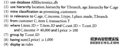 注意,我们想产生“promising_customers”与“non_promising_ customers”的分类模型。对于分类,通常可以说明一个属性为类标号属性,它的值显式地表示类。然而,在这个例子中,两个类是隐含的。即指定的数据集被检索并且被看作promising_ customers的例子,而customer表中的其余顾客看作non_promising_customers。分类在这个训练集的基础上进行。行9说明挖掘的结果以规则集的形式显示。一些分类方法的细节在第6章介绍。