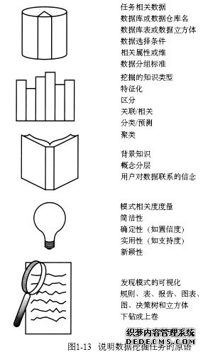 每个用户头脑中都有一个数据挖掘任务,即想进行的数据分析形式。数据挖掘任务可以用指定的数据挖掘查询的形式说明数据挖掘系统的输入。数据挖掘查询用数据挖掘任务原语定义。这些原语允许用户在知识发现过程中交互地与数据挖掘系统通信、指导挖掘过程,或从不同的角度或深度考察所发现的结果。数据挖掘原语说明定义如下,如图1-13所示的下述挖掘意图: