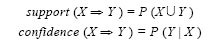 存在一些模式兴趣度的客观度量。这些度量基于所发现模式的结构和关于它们的统计。对于形如X.Y的关联规则,一种客观度量是规则的支持度support)。规则的支持度表示满足规则的事务数据库的事务所占的百分比。支持度可以取概率P (X∪Y ),其中,X∪Y表示同时包含X和Y的事务,即项集X和Y的并。关联规则的另一种客观度量是置信度confidence), 它评估发现的规则的确定性程度。置信度可以取条件概率P (Y | X ),即包含X的事务也包含Y 的概率。用更形式化的方法,支持度和置信度定义为: