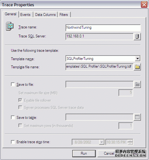 在Profiler里,你必须决定要记录什么,并考虑将所记录下来的服务器活动应该被保存在哪里。你可以选择将自己的追踪信息保存到数据库表格里或者是文件里。当选择将捕捉到的数据保存到表格里的时候,你还可以设置要保存数据行的最大数量。这样,Profiler就能够在一个任务繁重的系统里迅速地捕捉大量数据。但是由于这一点,你可能想要限制在一次追踪之中Profiler所要捕捉的数据总量。