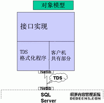 从图 2 可以看到,所有这些客户机 API 都有三个部分。最上面的部分实现 API 的细节,例如行集和游标应该是什么样等等。TDS 格式化程序负责处理实际请求,例如 SQL 语句,并将其封装成 TDS 消息包,发送给 SQL Server,获得返回的结果,然后再把结果反馈到接口实现。