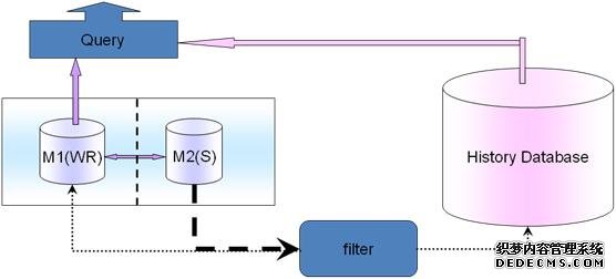 实现途径是通过 slave库查询出所有的数据,然后根据业务规则比如时间、某一个纬度等过滤筛选出数据,放入历史数据库(History Databases)里面。迁移完了,再回到主库M1上,删除掉这些历史数据。这样在业务层面,查询就要兼顾现在实时数据和历史数据,可以在filter 上面根据迁移规则把online查询和history查询对接起来。比如说一个月之内的在online库查询一个月之前的在history库查询,可以把这个规则放在DB的迁移filter层和应用查询业务模块层。如果可以的话,还可以配置更细化,通过应用查询业务模块层来影响DB的迁移filter层,比如以前查询分为一个月为基准,现在查询业务变化了,以15天为基准,那么应用查询业务模块层变化会自动让DB的filter层也变化,实现半个自动化,更加智能一些。