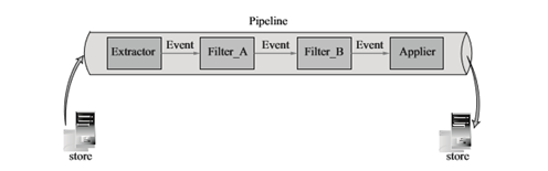 数据从源数据库向目标数据库的过程中,可能需要对数据进行一些过滤和转换,精卫本身的结构分为抽取器(Extractor)、管道(Pipeline)、分发器(Applier),数据从抽取器流入管道,管道中有过滤器可以执行对数据的一些过滤的操作,然后再交由分发器写入到目标,如图5-12所示。