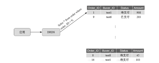 不管是TDDL平台还是DRDS,采用分库分表的方式将业务数据拆分后,如果每一条SQL语句中都能带有分库分表键,如图5-6所示是以自增的订单ID以8取模,将订单平均分布到8个数据库的订单表中,通过分布式服务层在对于SQL解析后都能精准地将这条SQL语句推送到该数据所在的数据库上执行,数据库将执行的结果再返回给分布式服务层,分布式服务层再将结果返回给应用,整个数据库访问的过程跟之前的单机数据库操作没有任何差别。这个是在数据进行了分库分表拆分后,SQL语句执行效率最高的方式。