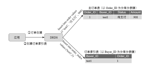 也就是应用在创建或更新一条按照订单ID为分库分表键的订单数据时,也会再保存一份按照买家ID为分库分表键的订单索引数据,如图5-10所示,其结果就是同一买家的所有订单索引表都保存在同一数据库中,这就是给订单创建了异构索引表。