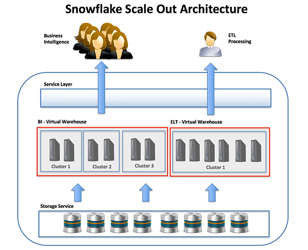 与其他数据库系统不同,Snowflake是针对云端构建的。它能够有效地支持无限量的虚拟仓库,即一些独立大小的计算群集。它们可以对于公共数据的存储进行共享式访问。这种EPP(Elastic Parallel Processing,弹性并行处理,请参见https://www.analytics.today/blog/four-stages-that-revolutionised-database-architecture)的架构,可以运行复杂的数据科学类操作。在针对相同数据进行ELT加载、以及商业智能查询时,该架构不会去争用任何的资源。