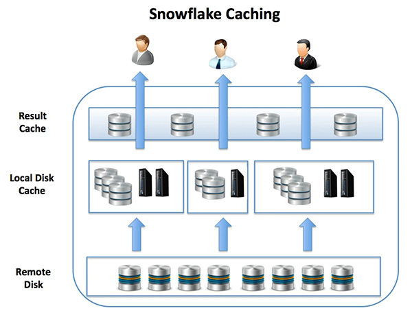 下图展示了Snowflake是如何自动地将数据缓存到虚拟仓库(本地的磁盘缓存)和结果缓存(Result Cache)中的。