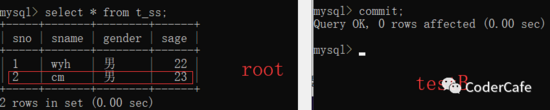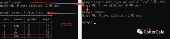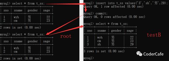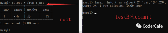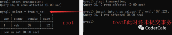 接着分别在root、testB中开启事务A、B,然后在B中向表t_ss插入一条数据。 这时候B中的事务还没有提交(commit),我们再在A中查表,可以看见, 即使B的事务还未提交,A中也可以查询到事务B插入的数据。