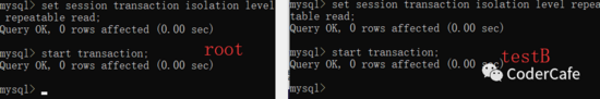 将事务隔离级别设置为 repeatable read(可重复读) ,并分别开启事务。