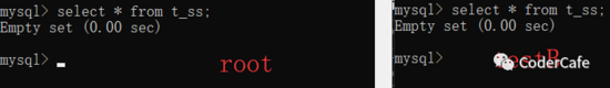 分别登录到用户root和testB,以表t_ss作为实验表,通过查询可以看到表t_ss是空的。