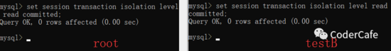 将root和testB的事务隔离级别设置为 read committed(读已提交)。
