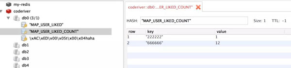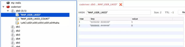 因为 Hash 里的数据都是存在一个键里,可以通过这个键很方便的把所有的点赞数据都取出。这个键里面的数据还可以存成键值对的形式,方便存入点赞人、被点赞人和点赞状态。