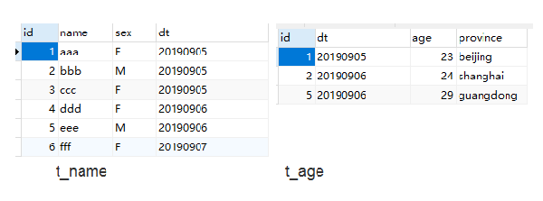 这种情况最好理解。t_name表,有id,name(用户名称),sex(性别),dt(注册日期)等字段。t_age表。有id,age(年龄),province(省份),dt(更新日期)等字段。表中包含的信息如下: