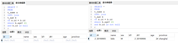 将b.age=24写到where里,发现结果中只有这一行,打破了“left join”以左表为主的限制。同样再来看下后两种情况写到where里会发生什么: