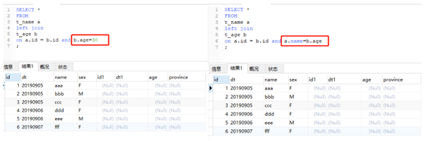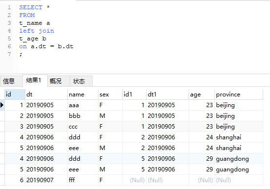 上面例子中,20190906的记录最终有4条,同样是因为满足了关联条件,是一种2对2的情况。这里我们还是回到t_name表做主表的情况,用dt来关联。可以预见,与2中相比,这次结果中会多一行20190907的,而b表相应的字段依然为空。