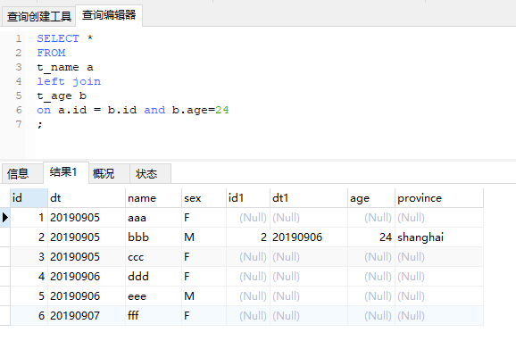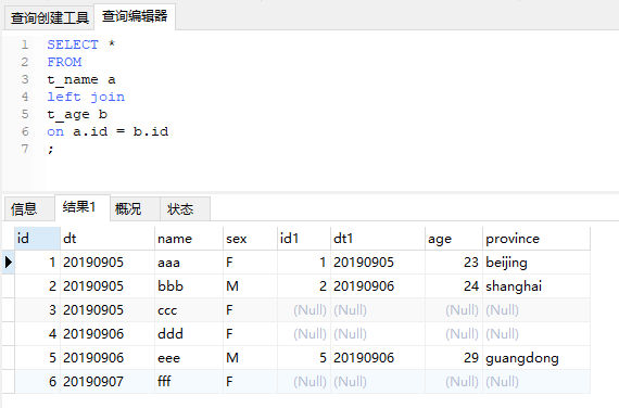 现在我们进行t_name(左表,别名a)和t_age(右表,别名b)的left join 操作,关联键为id。a表有6条记录,b表有3条记录,且关键的键是唯一的,因此最终结果以a表为准有6条记录,b表有3条关联不上,相应的记录中,b表所有的字段都为空。