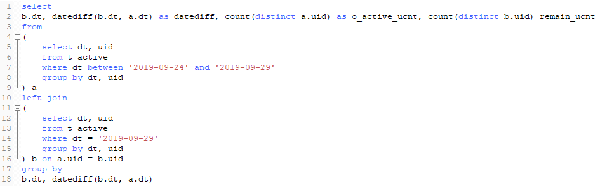 对于这个需求,我们可以使用left join进行自关联,用之前活跃的天作为左表,最终期望计算的天作为右表,计算日期差,并进行左右表分别计数。初步的SQL如下:(数据是自己编的)