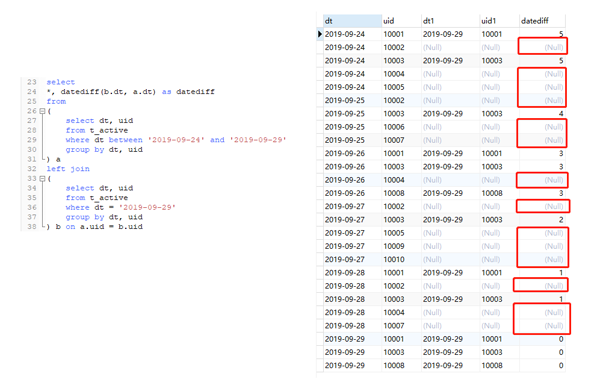 可以看到,这相当于是前文提到的不加where 条件的一对一关联,结果会以左表为准,关联不上的用null补齐。值得注意的是,关联不上的日期是null值,而null值在参与datediff的计算时,结果会是null。到这里你是不是明白一点了。由于null值参与计算,导致最终datediff 有null值,并且计数的时候,由于null值存在,最终用日期差作为维度的时候,导致左表和右表的数量是一样的。如下面代码所示: