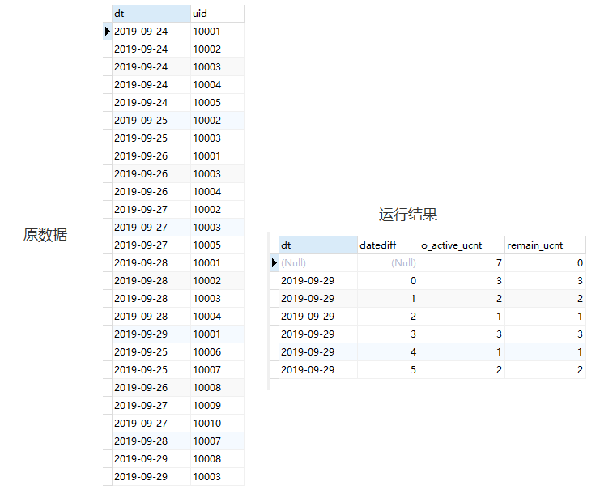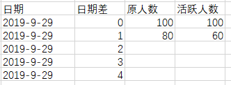 对于表中数据,我们可以这样理解。距离2019-09-29 0天(也就是2019-09-29)的活跃人数为100,2019-09-29当天活跃的还剩100,距离2019-09-29 1天(也就是2019-09-28)的活跃人数为80,2019-09-29当天还剩60。以此类推。