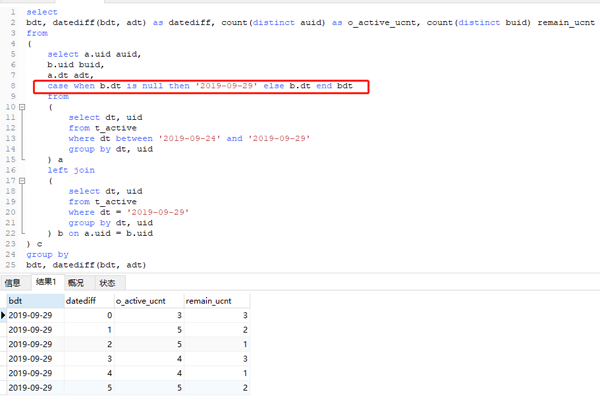 可以看到最终得到了想要的结果,以最后一行为例,它表示,距离2019-09-29 5天的那天(也就是2019-09-24)活跃的人数有5个,那些人在2019-09-29仍然活跃的有2人,你可以看一下明细数据核对一下。其余的以此类推。我们使用case when 把日期写死了,这个是建立在我们知道是哪天的基础上的。实际中可能是一个变量,但一定也是一个固定的值,需要具体情况具体分析。