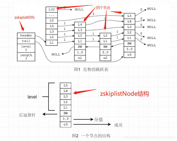 - 下图分别展示了完整的跳跃表和单个节点的详细结构图: