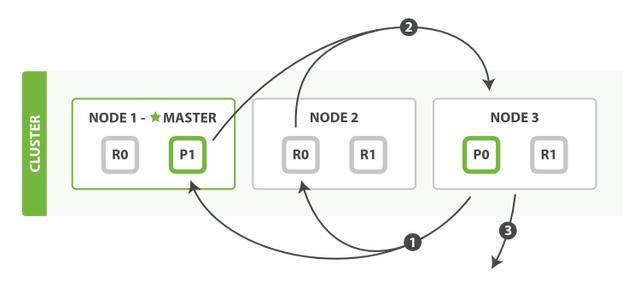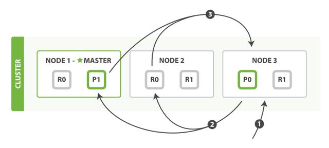 当用户向一个节点提交了一个索引新文档的请求,节点会计算新文档应该加入到哪个分片(shard)中。每个节点都存储有每个分片存储在哪个节点的信息,因此协调节点会将请求发送给对应的节点。注意这个请求会发送给主分片,等主分片完成索引,会并行将请求发送到其所有副本分片,保证每个分片都持有最新数据。