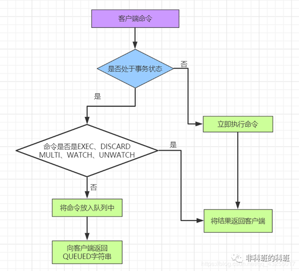 上面说到当客户端处于非事务的状态命令发送到服务端会被立即执行,若是客户端处于事务状态命令就会被放进命令队列。
