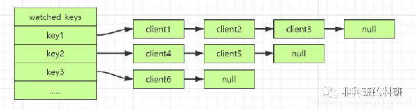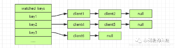 WATCH命令的底层实现中保存了watched_keys 字典,「字典的键保存的是监视的key,值是一个链表,链表中的每个节点值保存的是监视该key的客户端」。