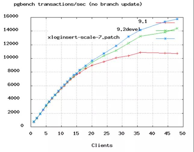 上图是 PostgreSQL 的 benchmark 数据,可以看到 TPS 增长率从 50 个连接数开始变缓。