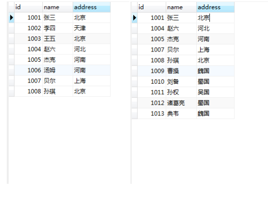 - INSERT INTO `t1` VALUES ('1001', '张三', '北京'), ('1002', '李四', '天津'), ('1003', '王五', '北京'), ('1004', '赵六', '河北'), ('1005', '杰克', '河南'), ('1006', '汤姆', '河南'), ('1007', '贝尔', '上海'), ('1008', '孙琪', '北京');