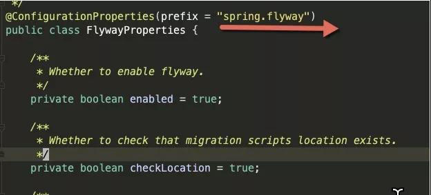 我们当然要看一下FlywayProperties这个文件所定义的配置项。可以看到它的前缀,就是spring.flyway。
