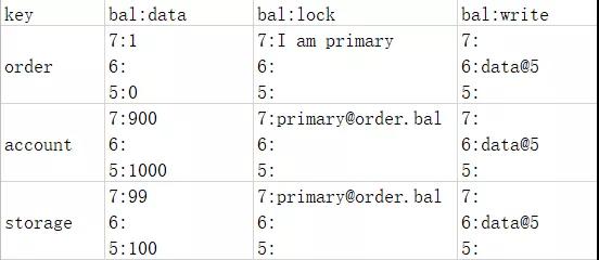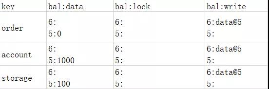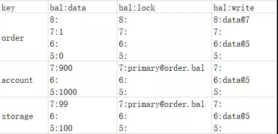 在commit阶段,协调节点只需要跟订单服务通信,因为订单服务拥有primary lock,也就是说协调节点只跟拥有primary lock的切片通信。这时数据如下表: