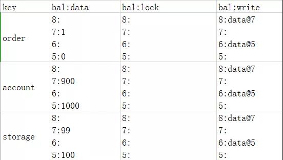 这时我们注意到除了order服务的锁没有了,而且增加了版本8指向版本7,说明订单服务已经没有私有版本了,但是账户服务和库存服务的私有版本还在。Percolator的独特之处就是在这里,它会启动异步线程来更新账户服务和库存服务。最终数据如下表: