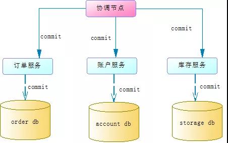 如果prepare阶段所有服务有返回了yes,那么协调节点就会通知各个服务执行commit操作,这时各个服务就会真正的提交本地事务。如下图: