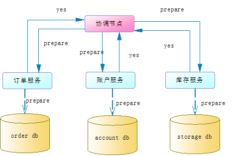 协调节点向所有服务发送prepare请求,每个服务收到prepare请求后会尝试执行本地事务,但不会真正提交本地事务。这个尝试执行的过程会检查到是否具备执行事务的条件,比如资源是否被锁定等,当所有服务都尝试执行成功后会给协调节点返回一个yes,如下图: