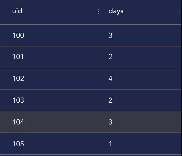 这一方法就是利用row_number给每一行生成一个连续的序号,这样,在连续活跃的时间段,就有了一个对照值,利用日期和行号这两者就可以得到一个差值,在连续活跃的时段内,其差值是相同的,那么我们按照这个差值进行分组就可以进一步计算本次连续活跃有多少天了。