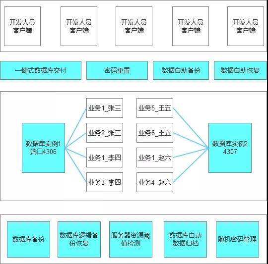 2. 开发人员的数据库使用配额,每个人最多可以申请创建5个数据库,累计存储空间最大不超过10G,且多个数据库实现集中部署(如单实例的多个数据库等)