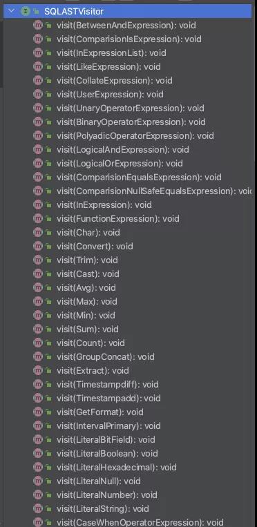 有了如上对AST的了解,接下来看对AST的操作,最基本的是遍历,利用ASTNode的accept,需要实现SQLASTVisitor接口,这个SQLASTVisitor定义如下: