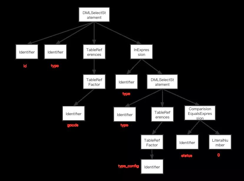 - Expression:表达式,比如and、or、比较等语句,体现在InExpression、ComparisionEqualsExpression、LiteralNumber、Identifier