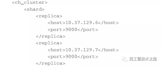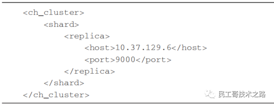 代码清单1所示是ClickHouse的一份集群配置示例,从字面含义理解这份配置的语义,可以理解为自定义集群ch_cluster拥有1个shard ( 分片 ) 和1个replica ( 副本 ),且该副本由10.37.129.6服务节点承载。