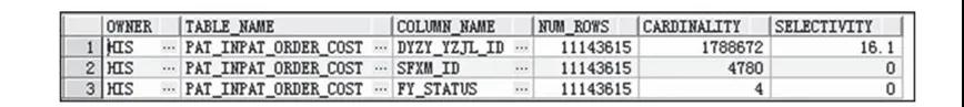 上述代码所示的业务SQL语句通过三张表进行关联,最终返回的行数为个位数,从执行计划中我们可以看出,Id=0,CBO计算总的COST为123K,其中绝大部分的COST是由Id=10的表pat_inpat_order_cost全表扫描所产生的。此时,我们需要重点关注 pat_inpat_order_cost与其他两张表格的关联情况,where条件中,pat_inpat_order_cost的sfxm_id和dyzy_yzjl_id除了与其他两张表的字段相关联之外,只有fy_status一个过滤条件,下面我们就来看下该列的选择性,代码如下: