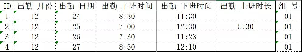 - 出勤_上班时间,出勤_下班时间,组_号)