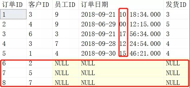 我们发现与Customers表里匹配上的订单日期被修改了,订单日期往后推迟了一小时,而没有匹配上的在订单表尾部增加了几行记录。这就是MERGE的实际应用了。