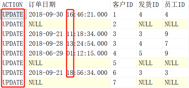 从上图我们看到,执行的动作都是更新,这里的动作只有UPDATE和DELETE,插入也属于更新,此外我们看到订单日期又往后推迟了一小时,是因为我们又一次执行了往后增加一小时的更新操作,其他的字段没变。