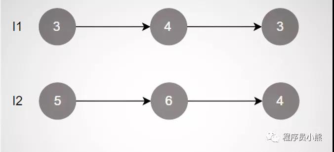 以 l1 = [3,4,3], l2 = [5,6,4] 为例子,如下图示: