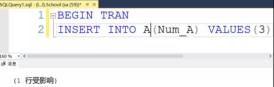 下面我们创建一个往里面写数据的事务(使用BEGIN TRAN就可以开始一个事务了)
