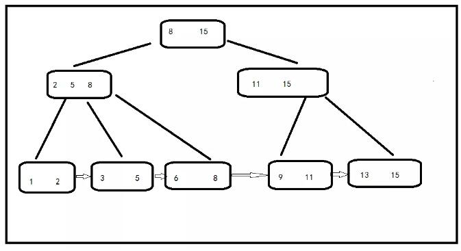 - 在上面的这一棵树中,根节点元素8是子节点258的最大的元素,根元素15也是。这时候要注意了,根节点最大的元素等同于整个B+树的最大的元素,以后无论是怎么插入或者是删除,始终都要保持最大的元素在根节点中。